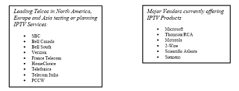 Confrontadas com a descida do volume de negócios associado ao telefone, as empresas de telecomunicações de todo o mundo investem hoje milhares de milhões para montarem redes de alta definição capazes de fornecer acesso ao IPTV. Contudo, essas empresas debatem-se com dificuldades para convencer o “consumidor-tipo” a optar por esta nova oferta. Dado que o cabo e o satélite já satisfazem muitos clientes. As empresas que mais se destacam no investimento na tecnologia IPTV, estão ilustradas na figura seguinte: