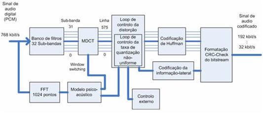 Na entrada temos os dados de áudio PCM, que em seguida passam através do banco de filtros que os divide em sub-bandas. A filtragem é efectuada em paralelo com a análise psico-acústica que vai determinar a SMR (relação sinal-máscara) de cada uma das sub-bandas. O bloco de controlo de distorção utiliza as SMR para a decisão de como dividir o número total de bits de codificação que estão disponíveis. Por fim, são formatadas num bitstream as amostras quantificadas e codificadas, segundo a norma.