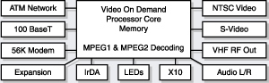 Um sistema de VoD, como se pode ver na figura 3, é constituído por três blocos que são o(s) servidor(es) onde estão armazenados os conteúdos, a rede que transporta os mesmos até à Set-Top-Box (STB) do cliente e a STB do cliente que recebe o stream, descodificando-o e passando o conteúdo para o cliente ver. Cliente O cliente de um serviço de VoD possui equipamento para ver os conteúdos (por exemplo, uma televisão ou um monitor e colunas) mas para interagir com o sistema tem de ter um controlador que envie os seus comandos para o servidor através da rede. Este controlador, a STB, para além de transmitir os comandos do cliente também armazena os sinais de vídeo recebidos do servidor, descodifica os sinais comprimidos e envia os sinais descodificados na altura certa para o equipamento de visualização. Na figura 4 pode ver-se um esquema de uma STB com o processador e descodificador e os diversos interfaces necessários. Rede Um serviço de VoD necessita que os conteúdos alugados pelo cliente sejam visualizados em tempo real. O stream de vídeo consiste em frames de imagens, sons correspondentes às imagens e texto associado. Esta quantidade de informação tem de ser enviada ao cliente de modo contínuo com o mínimo de atraso e este é o grande requisito da rede que suporta o serviço. Uma rede de VoD deve ser de alta velocidade sem que hajam grandes erros de transmissão visto que a retransmissão não é uma opção. Actualmente, as redes já atingem velocidades altas de bébito (por exemplo 20Mbit/s) e com a implementação de redes que utilizam fibra óptica até casa do cliente, este tem já acesso a velocidades ainda mais altas (por exemplo 100Mbit/s). |