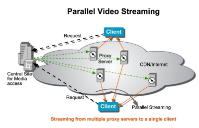 Se existirem, num dado momento, problemas de tráfego na rede, a qualidade de serviço torna-se imprevisível e o cliente pode ver os conteúdos com menor qualidade que o desejado. Uma solução para este problema é fazer o streaming do conteúdo de mais de um servidor em simultâneo como mostra a figura 9. Nesta situação os pedidos dos clientes vão até à central de gerenciamento e são posteriormente transmitidas em simultâneo para vários servidores proxy que começam a enviar o conteúdo para o cliente em streams paralelos. |
