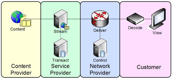 • Service Provider: adquire os conteúdos do prestador de conteúdos e coloca-os num pacote como um serviço para o consumidor. Basicamente é a entidade que fornece o serviço IPTV para o utilizador final.