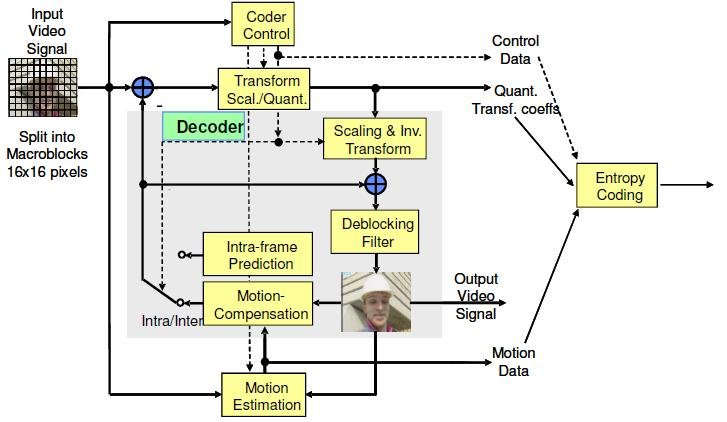 Analisando a imagem acima, constata-se a existência de um filtro de desbloqueio, que tem como objectivo aumentar a qualidade subjectiva e objectiva da imagem. É devido à existência deste filto na arquitectura de codificação que as arestas dos blocos são suavizadas, sem que a imagem fique desfocada, o que implica um aumento na qualidade subjectiva, ou seja, o observador não se apercebe da mudança.