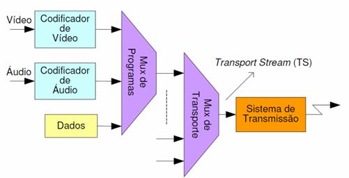 Com a implementação da tecnologia digital nas transmissões televisivas por radiofrequências é possível a recepção de múltiplos canais numa única frequência (actual canal analógico) garantindo uma melhor qualidade audiovisual e funcionalidades adicionais. O sistema básico definido pelas normas DVB é ilustrado na Figura 2 e é constituído por codificadores de áudio e vídeo, multiplexagem e transmissão digital dos dados multiplexados. Estes últimos constituem um fluxo de dados designado por Transport Stream (TS). Um único TS pode incluir vários programas de Televisão e canais áudio.