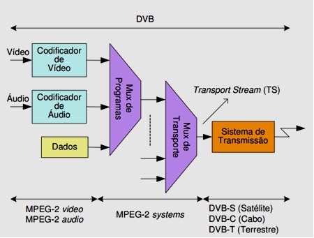 O sistema básico da TV digital definido pelas normas DVB é ilustrado na Figura 1, é constituído por codificadores de áudio e vídeo, multiplexagem e transmissão digital dos dados multiplexados. Estes últimos constituem um fluxo de dados designado por Transport Stream (TS). Um único TS pode incluir vários programas de Televisão e canais áudio.