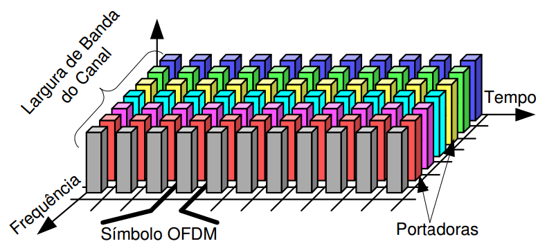 Um símbolo OFDM corresponde ao conjunto de símbolos transportado por todas as portadoras durante o tempo de duração de um símbolo. A Figura 2 ilustra de forma simples as várias dimensões de um sinal OFDM.