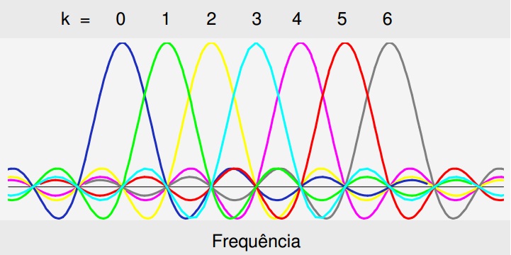 Espectro de portadoras ortogonais adjacentes num sinal OFDM.
