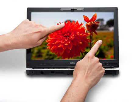- Com um dedo, um toque, dois toques, toque prolongado, scroll (arrastamento do dedo para subir ou descer página), translação, flick (agitar com toque prolongado para fazer desaparecer uma janela, aplicação ou ecrã);