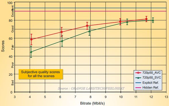A European Broadcast Union (EBU) utilizou a tecnologia da Octoshape na realização de testes de emissão através p2p vídeo sharing . Estes testes tiveram uma duração de seis meses e utilizaram um débito binário de 12 Mbit/s, 10 Mbit/s, 8 Mbit/s, 6 Mbit/s e 4 Mbit/s. Para compressão foi utilizada a norma H264/AVC e SVC (MPEG/ITU JSVM) , sendo esta definição standard codificada com 2 Mbit/s. Os resultados estão ilustrados na imagem \ref{fig:TestesEmissao , em que a métrica scores quantifica a qualidade subjectiva utilizada para testes de qualidade de vídeo (SAMVIQ) .