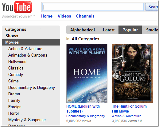 O Youtube conta também com um serviço de aluguer de filmes (produzidos por estúdios).