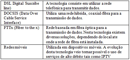 Tabela 1: Diferentes redes onde é possível existir IPTV