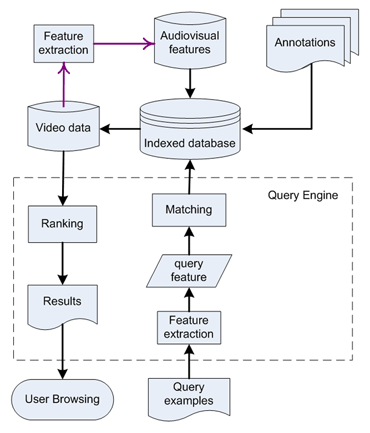 A pesquiza pode ser feita de diversas formas, por atributos, por palavras-chave, por composições, por padrões espaciais e temporais ou por exemplo de imagem ou vídeo. No último caso o procedimento realizado sobre os conteúdos da base de dados também tem de ser executado sobre o exemplo sugerido. As semelhanças são avaliadas e por fim os resultados são mostrados pela ordem de semelhança obtida.