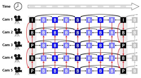 B. ArquitecturaO vídeo com mais de uma vista – multiview video – contém uma grande quantidade de dependências estatísticas, visto que, todas as camaras capturam a mesma cena de diferentes pontos de vista. Esta redundância espacial, combinada com a redundância temporal, é a chave do sucesso para a eficiência de codificação do MVC. A melhor predição de uma frame (imagem individual de um vídeo) de uma certa camara, pode não só ser explorada temporalmente nas frames da mesma camara, como também nas frames das camaras vizinhas. Na literatura, a esta possibilidade dá-se o nome de inter-view prediction – predição entre-vistas.