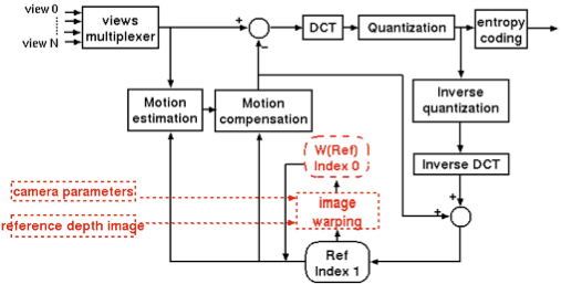 A arquitectura de blocos base de alto nível da tecnologia MVC, consiste então, numa arquitectura típica de um codificador H.264/AVC, com uma componente de multiplexagem das diferentes vistas e a respectiva estimação de profundidade - Figura 3. Portanto, esta estrutura permite usufruir das possibilidades poderosas de compressão do codec H.264/AVC, com a diferença de que se têm mais imagens – das diferentes câmaras – guardadas em memória, e mais um bloco de estimação de profundidade. Este último é o que permite construir uma imagem 3D.