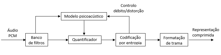 Banco de filtros: realiza uma decomposição tempo-frequência, do sinal de áudio, quer para permitir identificar as oportunidades de efeito de máscara, quer para permitir moldar o ruído de quantificação.