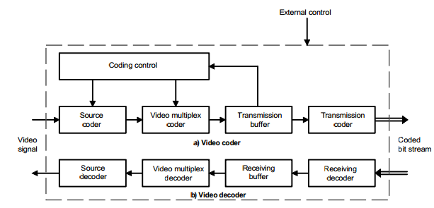 Processo de codificação e descodificação de vídeo: O sinal de vídeo comprimido é multiplexado com os parâmetros de codificação. Esta informação é armazenada na memória de saída, que informa o módulo de controlo da codificação, do seu estado de enchimento ou ocupação. A taxa de ocupação da memória de transmissão induz no controlador da codificação a regulação de débito binário gerado, nomeadamente através de alteração do passo de quantificação do codificador. O codificador de canal introduz mecanismos de protecção do fluxo de dados contra erros do canal. Na descodificação do sinal de vídeo, o fluxo de dados comprimido é processado pelos diversos módulos, por uma ordem inversa à do processo de codificação [8].
