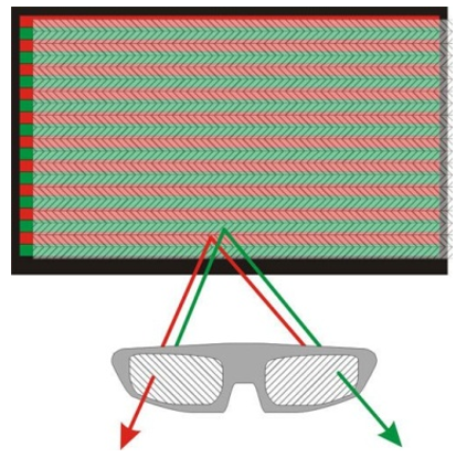 Na Figura 10 está representado o princípio de funcionamento dos óculos passivos. Neste caso, em cada frame, a imagem é composta por linhas horizontais onde a luz emitida tem duas polarizações distintas alternadamente. Esta divisão horizontal tem como problema o facto de que existe uma redução da resolução da imagem apresentada.