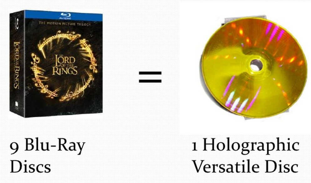 A possibilidade de armazenar grandes quantidades de informação num meio é de grande importância, para armazenamento e processamento de informação ou de imagens. O meio de gravação tem de converter o padrão de interferência original num elemento óptico que modifica ou a amplitude ou a fase de um feixe de luz incidente, em proporção à intensidade do campo de luz original. Na área da tecnologia da informação testa-se o uso de hologramas como uma forma "ótica" de armazenamento de dados, que permite armazenar uma alta densidade de informações em cristais ou foto-polímeros. Enquanto que nos aparelhos de DVD atuais (incluindo o Blu-Ray e o extinto HD-DVD) lêem e gravam as informações no disco numa ou mais camadas através de um sistema que altera o foco do raio laser, foi criado um novo disco onde o raio é dividido, alterado e recombinado de modo a criar padrões de interferência. Estes padrões na verdade são pequenos hologramas gravados por toda a camada sensível do disco, que ocupam um espaço muito pequeno. Assim pode-se gravar uma densidade enorme de informação chegando ao patamar dos Terabytes de informação num único disco. Isto equivale a uma capacidade de armazenamento 800 vezes maior do que a de um DVD normal. Esta tecnologia tem o nome de Holographic Versatile Disc (HVD)[8][9][10].