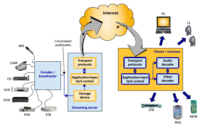 Independentemente da tecnologia utilizada, a arquitetura de uma rede de media streaming divide-se essencialmente em 3 partes: Encoder/Broadcaster, Streaming server e Clients/receivers.