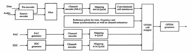 Os serviços em cima mencionados (FAC/SDC/DATA/AUDIO) convergem (sincronizados) para um OFDM CELL MAPPER onde vai ser criado o sinal OFDM, e de seguida transmitido. |